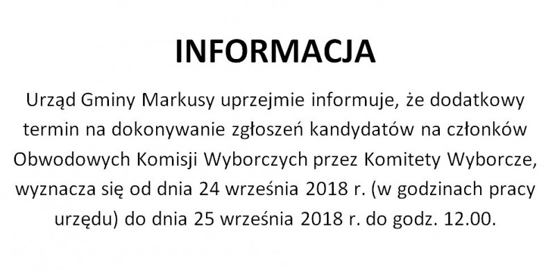 Wersja obowiązująca z dnia 21-09-2018 14:56:26 Drukuj Informacja dotycząca zgłoszeń kandydatów na członków Obwodowych Komisji Wyborczych