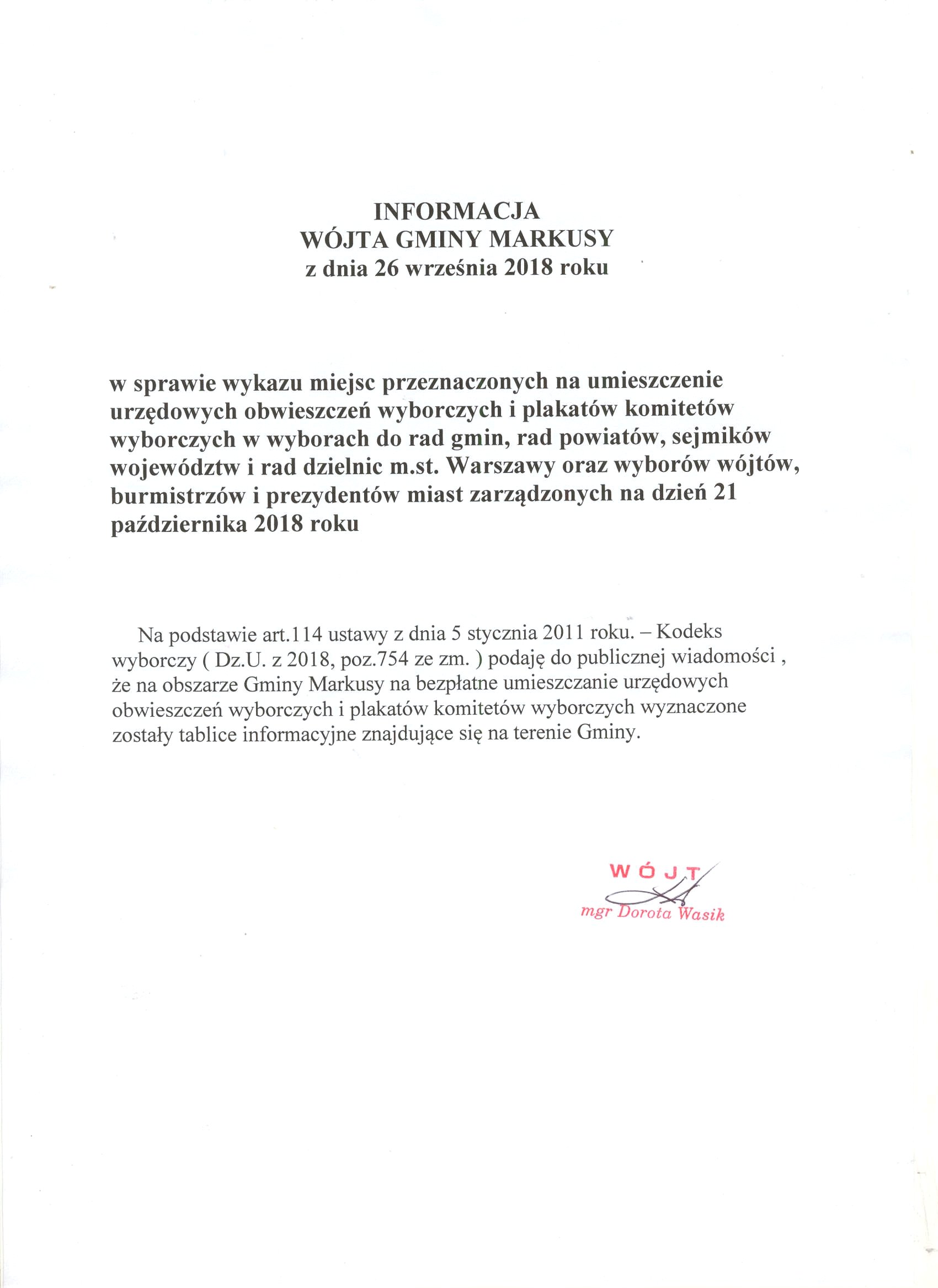 Informacja Wójta Gminy Markusy z dnia 26.09.2018 r. w sprawie wykazu miejsc przeznaczonych na umieszczenie urzędowych obwieszczeń wyborczych i plakatów komitetów wyborczych w wyborach samorządowych 2018 zarządzonych na dzień 21.10.2018 r.