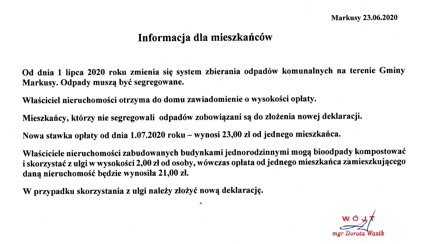 Wersja obowiązująca z dnia 25-06-2020 08:34:48 Drukuj Komunikat Urzędu Gminy Markusy w sprawie nowych opłat za wywóz odpadów komunalnych i nowych wzorach deklaracji http://markusy.pl/images/ogloszenia2020/DEKLARACJA.docx http://markusy.pl/images/ogloszenia2020/DEKLARACJA.pdf Załączniki Nowe stawki za odpady format: image/jpeg, rozmiar: 375.28 KB, data dodania: 25-06-2020 08:34:48