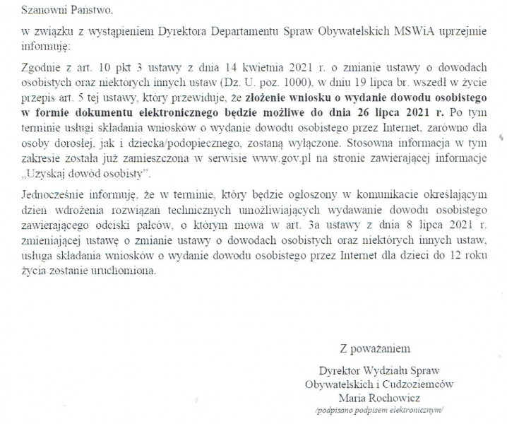 Wersja obowiązująca z dnia 23-07-2021 11:06:42 Drukuj Ogłoszenie w sprawie składania wniosków o dowód osobisty przez internet Załączniki Ogłoszenie format: image/jpeg, rozmiar: 258.54 KB, data dodania: 23-07-2021 11:06:42