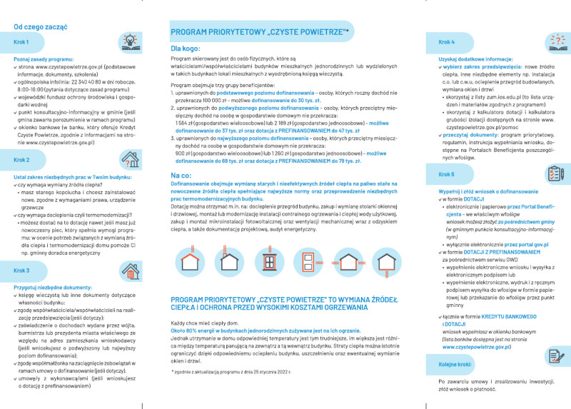 W związku z ogłoszeniem w dniu 15 grudnia 2022 r. ZMIAN w programu „Czyste Powietrze”, które zostaną wdrożone od 03 stycznia 2023 r. uprzejmie informujemy, że opublikowano na stronie https://czystepowietrze.gov.pl/od-3-stycznia-2023-r-rusza-nowa-wersja-programu-czyste-powietrze/ komunikat o uruchomieniu nowej wersji programu Czyste Powietrze. Z tej strony link przekierowujący prowadzi do podstrony: https://czystepowietrze.gov.pl/czyste-powietrze/# do-pobrania, gdzie zamieszczony jest program z załącznikami, wzór umowy beneficjenta z wykonawcą oraz lista banków prowadzących nabór wniosków o dotacje na częściową spłatę kapitału kredytu bankowego (wzór umowy i lista banków są w dotychczasowej wersji, tj. niezmienione).