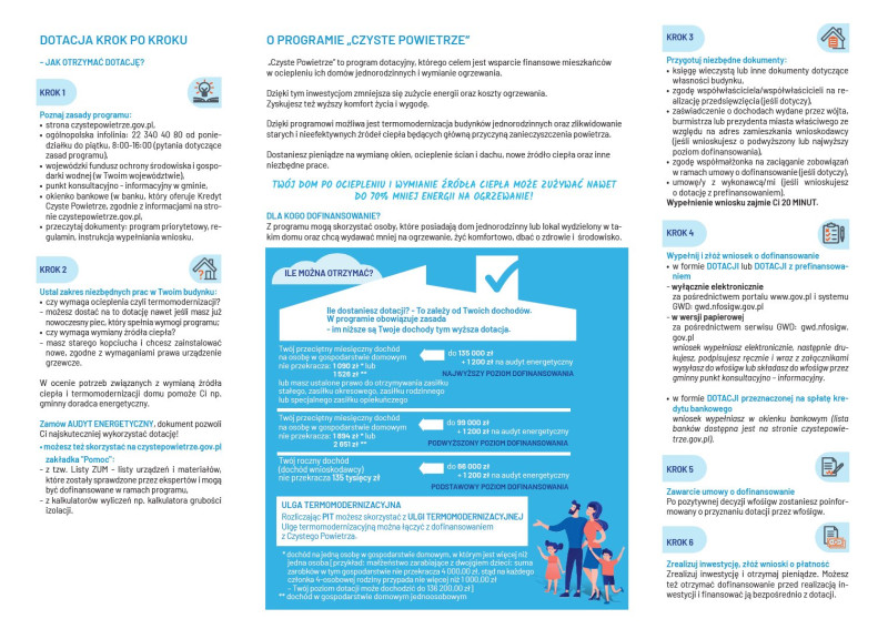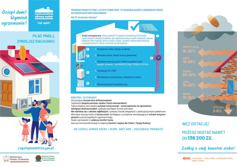 W związku z ogłoszeniem w dniu 15 grudnia 2022 r. ZMIAN w programu „Czyste Powietrze”, które zostaną wdrożone od 03 stycznia 2023 r. uprzejmie informujemy, że opublikowano na stronie https://czystepowietrze.gov.pl/od-3-stycznia-2023-r-rusza-nowa-wersja-programu-czyste-powietrze/ komunikat o uruchomieniu nowej wersji programu Czyste Powietrze. Z tej strony link przekierowujący prowadzi do podstrony: https://czystepowietrze.gov.pl/czyste-powietrze/# do-pobrania, gdzie zamieszczony jest program z załącznikami, wzór umowy beneficjenta z wykonawcą oraz lista banków prowadzących nabór wniosków o dotacje na częściową spłatę kapitału kredytu bankowego (wzór umowy i lista banków są w dotychczasowej wersji, tj. niezmienione).