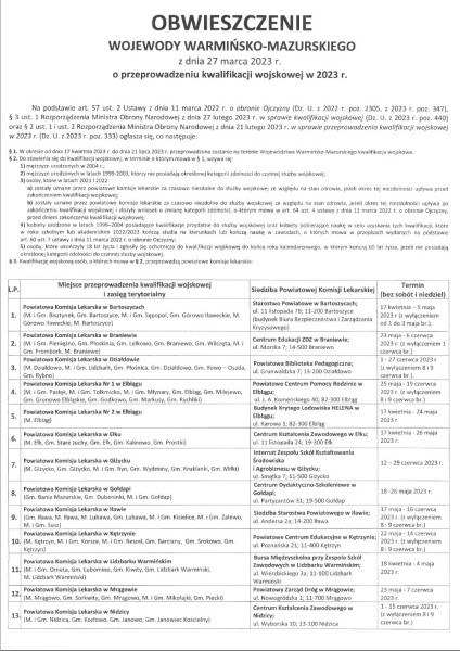 Wersja obowiązująca z dnia 31-03-2023 09:04:43 Drukuj Kwalifikacja wojskowa 2023 Załączniki OBWIESZCZENIE format: pdf, rozmiar: 357.24 KB, data dodania: 31-03-2023 09:04:43