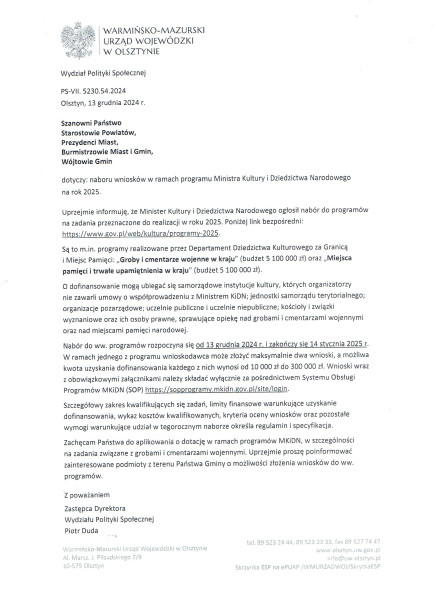 Wersja obowiązująca z dnia 17-12-2024 09:51:03 Drukuj Nabór wniosków w ramach programu Ministra Kultury i Dziedzictwa Narodowego na rok 2025 Załączniki Pismo format: pdf, rozmiar: 518.86 KB, data dodania: 17-12-2024 09:51:03