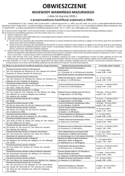 Wersja obowiązująca z dnia 15-01-2026 12:59:18 Drukuj OBWIESZCZENIE WOJEWODY WARMIŃSKO-MAZURSKIEGO z dnia 14 stycznia 2026 r. o przeprowadzeniu kwalifikacji wojskowej w 2026 r. Załączniki Obwieszczenie Wojewody W-M w 2026 r. format: pdf, rozmiar: 101.34 KB, data dodania: 15-01-2026 12:59:18